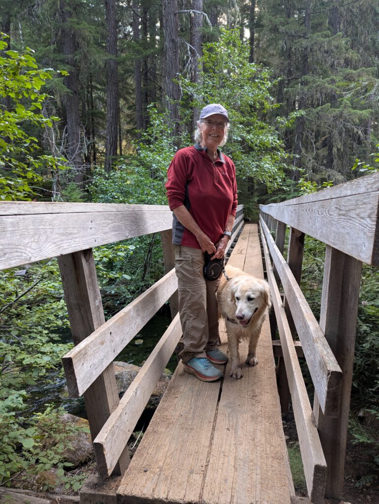 July 18 – 20, 2023 – Lost Creek Campground is located in the Mt. Hood National Forest near the town of Zigzag, OR. We were joined by my son Karsten and his wife Christine and their dog, Lucy. We had a very large double site (#2) which had ample shade and was close to the Lost Creek where Penny enjoyed cooling off in the water. We hiked the Ramona Falls Trail for 1.5 miles along the Sandy River. The campground was very quiet mid-week and without any road noise.