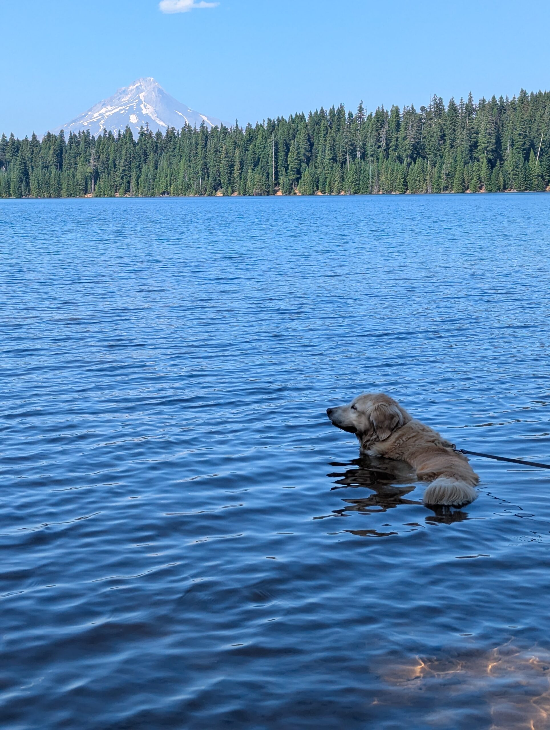 Sept. 2 – 4, 2025 – Gone Creek Campground is located in the Mt. Hood National Forest and sits on the edge of Timothy Lake, in the shadows of Mt. Hood. The campground was built and is run by PGE, which manages the Timothy Lake Dam that created the lake on the Clackamas River. On our way there, we visited the Zigzag Falls for a picnic and hike. Our reserved campsite was without shade, so we quickly found and moved to #47 which was great. We enjoyed a marvelous hike up to the Pacific Crest Trail. Penny enjoyed a couple swims in the lake as well. We listened to a flock of ravens, whose cries were very loud and angry each evening.
