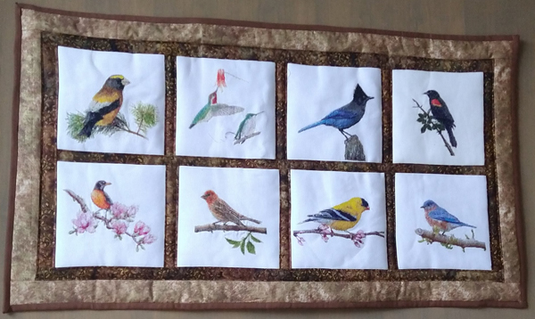 After finishing the flower quilt, I decided to repeat the project using favorite birds, all cross-stitched into 8″ square blocks. Once they were completed, I added borders and batting and edges to make them into another wall hanging quilt.